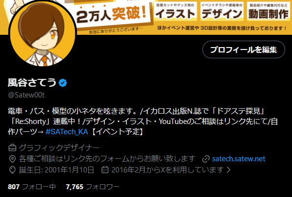 普段はtoC領域でチラシやロゴなどの平面媒体を中心に手掛けているが、本名がバレてしまうので本業の作品は非公開。プロスポーツチームのグッズデザインや大手自動車会社が展開する事業のロゴデザインを手掛けたことが自慢。